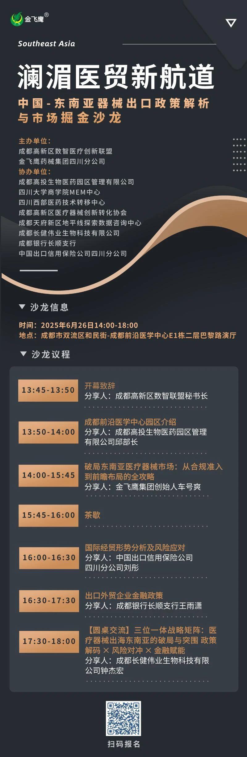 為助力國內醫(yī)療器械企業(yè)把握這一黃金機遇,我們聯(lián)合成都高新區(qū)數(shù)智醫(yī)療創(chuàng)新聯(lián)盟特別策劃了“瀾湄醫(yī)貿新航道——中國-東南亞器械出口政策解析與市場掘金沙龍”,本次沙龍由成都高新區(qū)數(shù)智醫(yī)療創(chuàng)新聯(lián)盟、金飛鷹藥械集團四川分公司主辦,成都高投生物醫(yī)藥園區(qū)管理有限公司、四川大學商學院MEM中心、四川西部醫(yī)藥技術轉移中心、成都高新區(qū)醫(yī)療器械創(chuàng)新轉化協(xié)會、成都天府新區(qū)地平線探索數(shù)據(jù)咨詢中心、成都長健偉業(yè)生物科技有限公司、成都銀行長順支行、中國出口信用保險公司四川分公司協(xié)辦,誠邀廣大行業(yè)同仁與我們共同探討這片百億藍海市場的掘金之道!