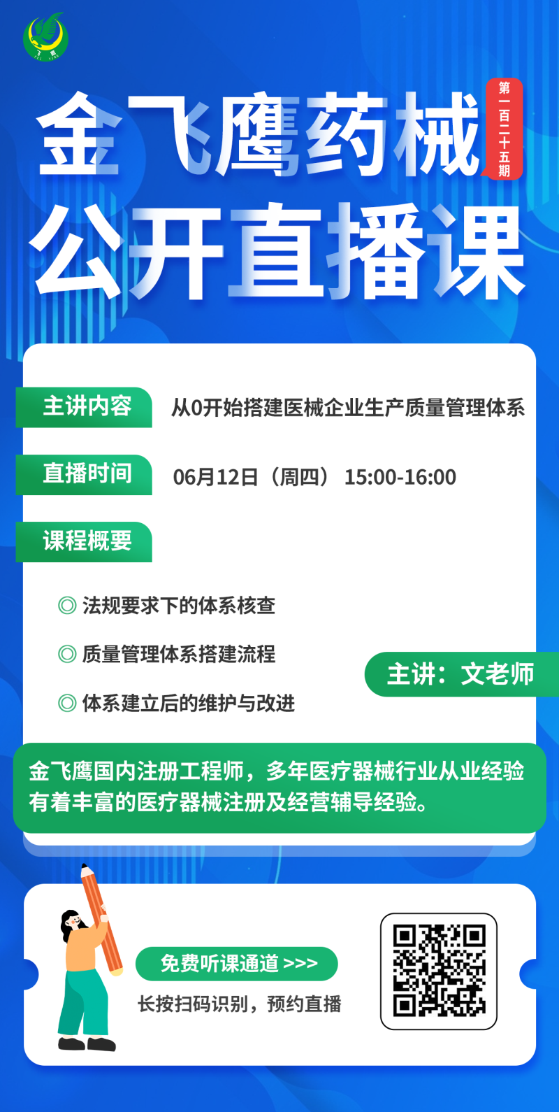 6月12日下午3點(diǎn),金飛鷹國(guó)內(nèi)注冊(cè)工程師、有著豐富醫(yī)療器械注冊(cè)及經(jīng)驗(yàn)輔導(dǎo)經(jīng)驗(yàn)的文老師給大家?guī)怼?/span>從0開始搭建醫(yī)械企業(yè)生產(chǎn)質(zhì)量管理體系》,感興趣的朋友記得提前預(yù)約,我們直播間不見不散~