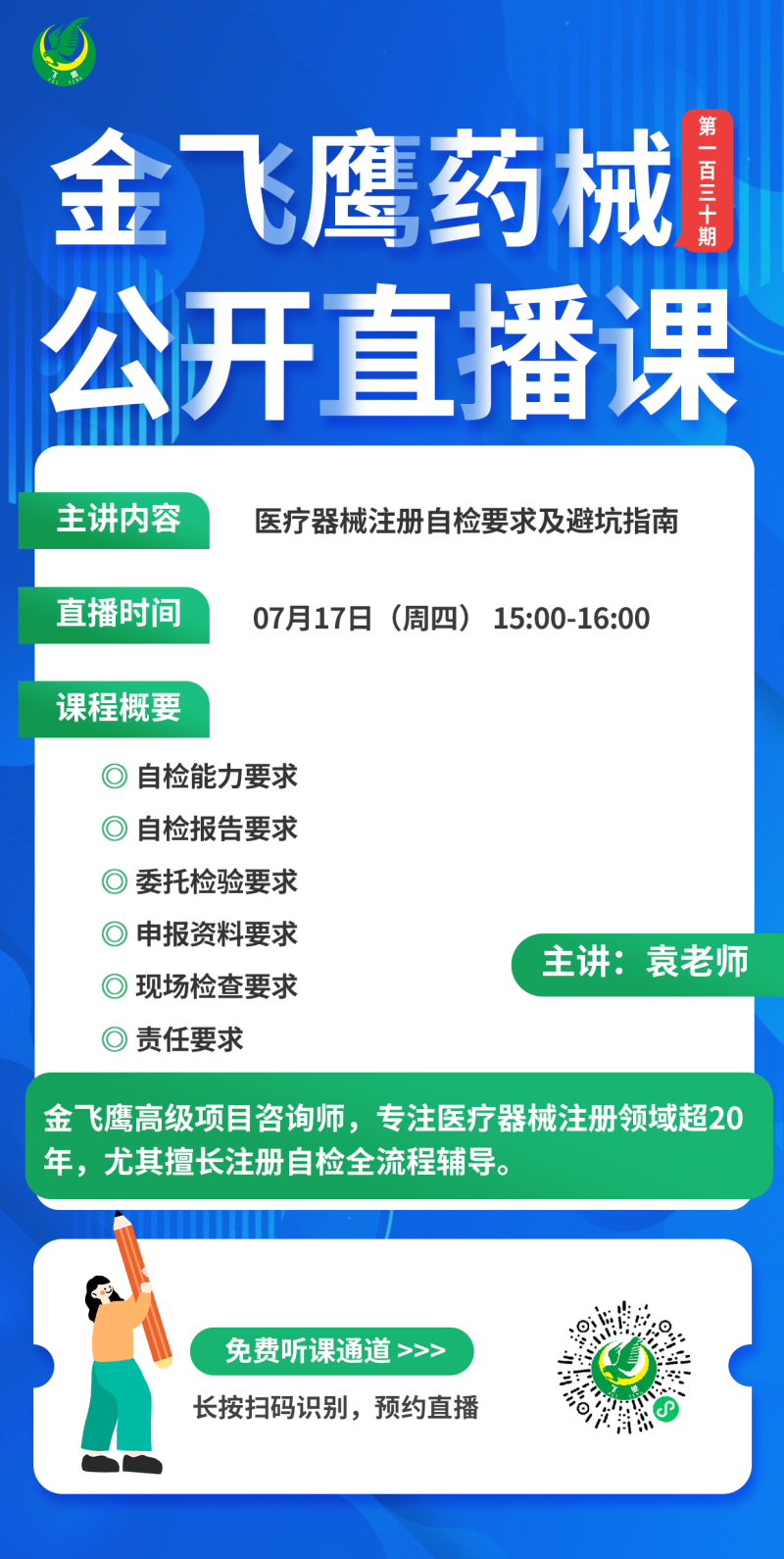 7月17日下午3點(diǎn),金飛鷹高級(jí)項(xiàng)目咨詢師,專注醫(yī)療器械注冊(cè)領(lǐng)域超20年,尤其擅長(zhǎng)注冊(cè)自檢全流程輔導(dǎo)的袁老師給大家?guī)?lái)《醫(yī)療器械注冊(cè)自檢要求及避坑指南》,在一一梳理注冊(cè)自檢各方面要求的同時(shí),還會(huì)結(jié)合過往的實(shí)際輔導(dǎo)案例給大家總結(jié)避坑指南及現(xiàn)場(chǎng)核查應(yīng)對(duì)策略,感興趣的朋友記得提前預(yù)約!