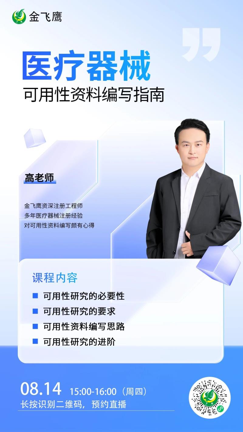 8月14日下午3點,金飛鷹資深注冊工程師,擁有多年醫(yī)療器械行業(yè)經驗,對可用性資料頗有研究的高老師給大家?guī)怼?/span>醫(yī)療器械可用性資料編寫指南》,他將結合實際案例,詳細拆解可用性研究資料的編寫要素,為企業(yè)提供切實可行的指導建議,感興趣的朋友記得提前預約!
