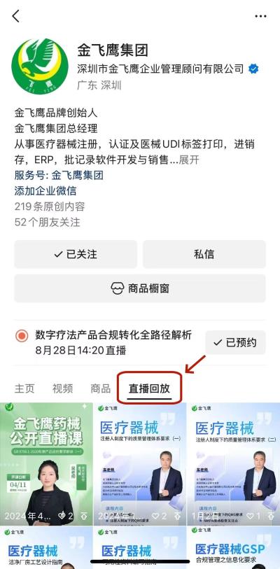 往期直播培訓課程支持回放,關(guān)注“金飛鷹藥械咨詢服務”視頻號并點擊視頻號主頁,即可查看“直播回放”哦~