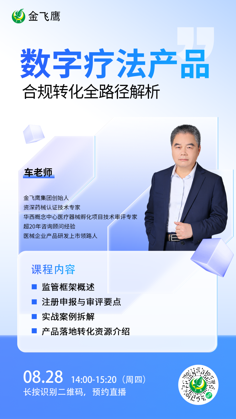 金飛鷹直播培訓,是每周一次的固定培訓欄目,優(yōu)選金飛鷹國內(nèi)外資深注冊/項目老師定期為大家講解醫(yī)療器械注冊相關(guān)知識,解答大家在醫(yī)療器械注冊過程中的諸多疑問。