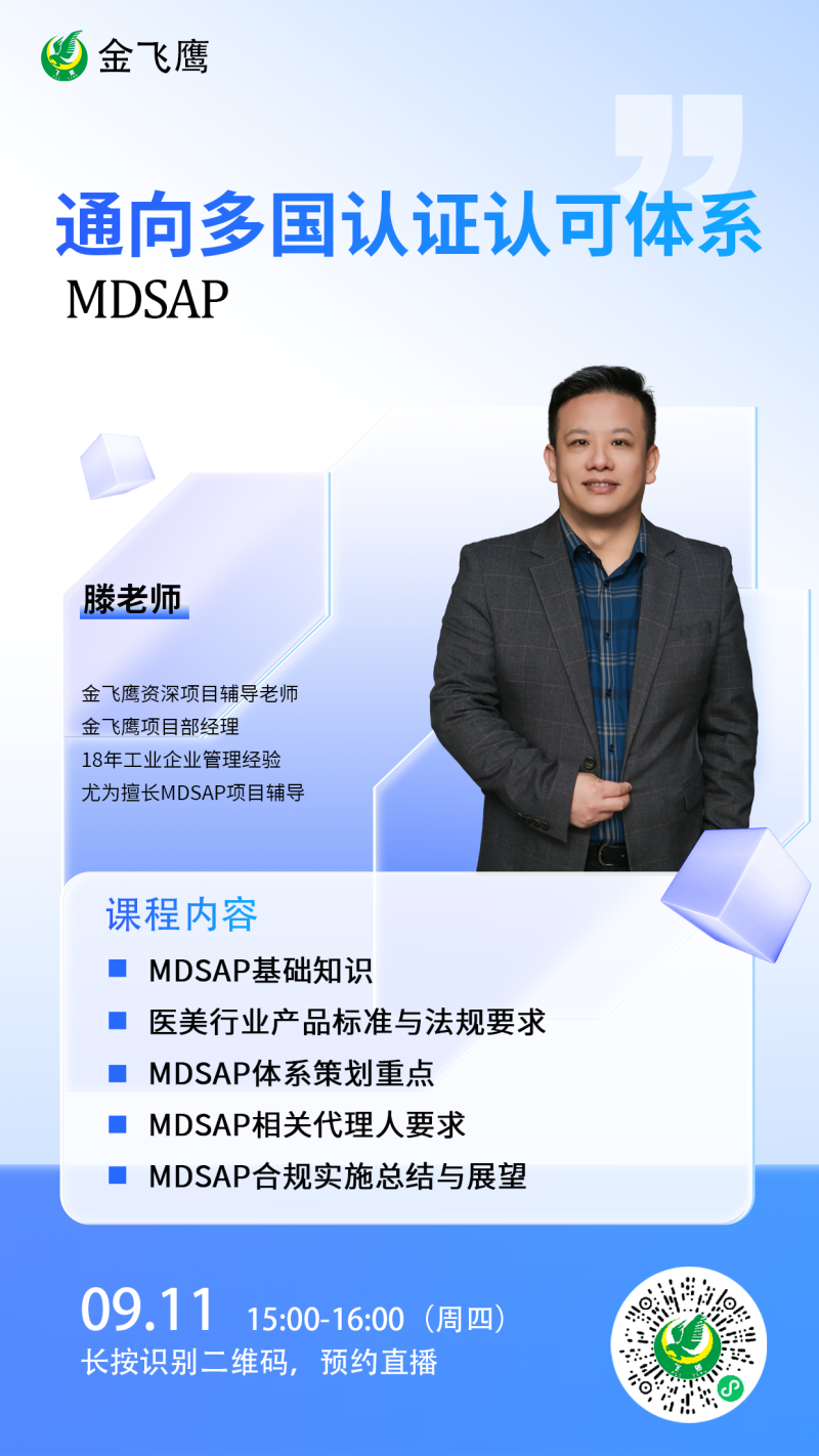 9月11日下午3點,金飛鷹高級項目咨詢師、有著諸多MDSAP項目輔導經驗的滕老師,給大家深入淺出地講解MDSAP審核的核心邏輯與應對技巧,讓您不僅“知其然”,更“知其所以然”!感興趣的朋友記得提前預約,鎖定這場合規(guī)必修課!