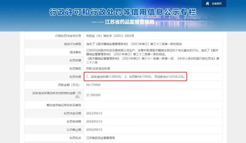 近日,江蘇省藥監(jiān)局官網(wǎng)公布一則行政處罰信息,江蘇某醫(yī)械企業(yè)因生產(chǎn)、經(jīng)營(yíng)未取得醫(yī)療器械注冊(cè)證的個(gè)性化基臺(tái),被罰941709元,同時(shí)被沒(méi)收違法所得313903元,總計(jì)被罰沒(méi)1255612元。