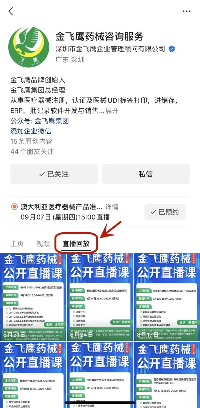 往期直播培訓(xùn)課程支持回放,關(guān)注“金飛鷹藥械咨詢服務(wù)”視頻號(hào)并點(diǎn)擊視頻號(hào)主頁,即可查看“直播回放”哦~