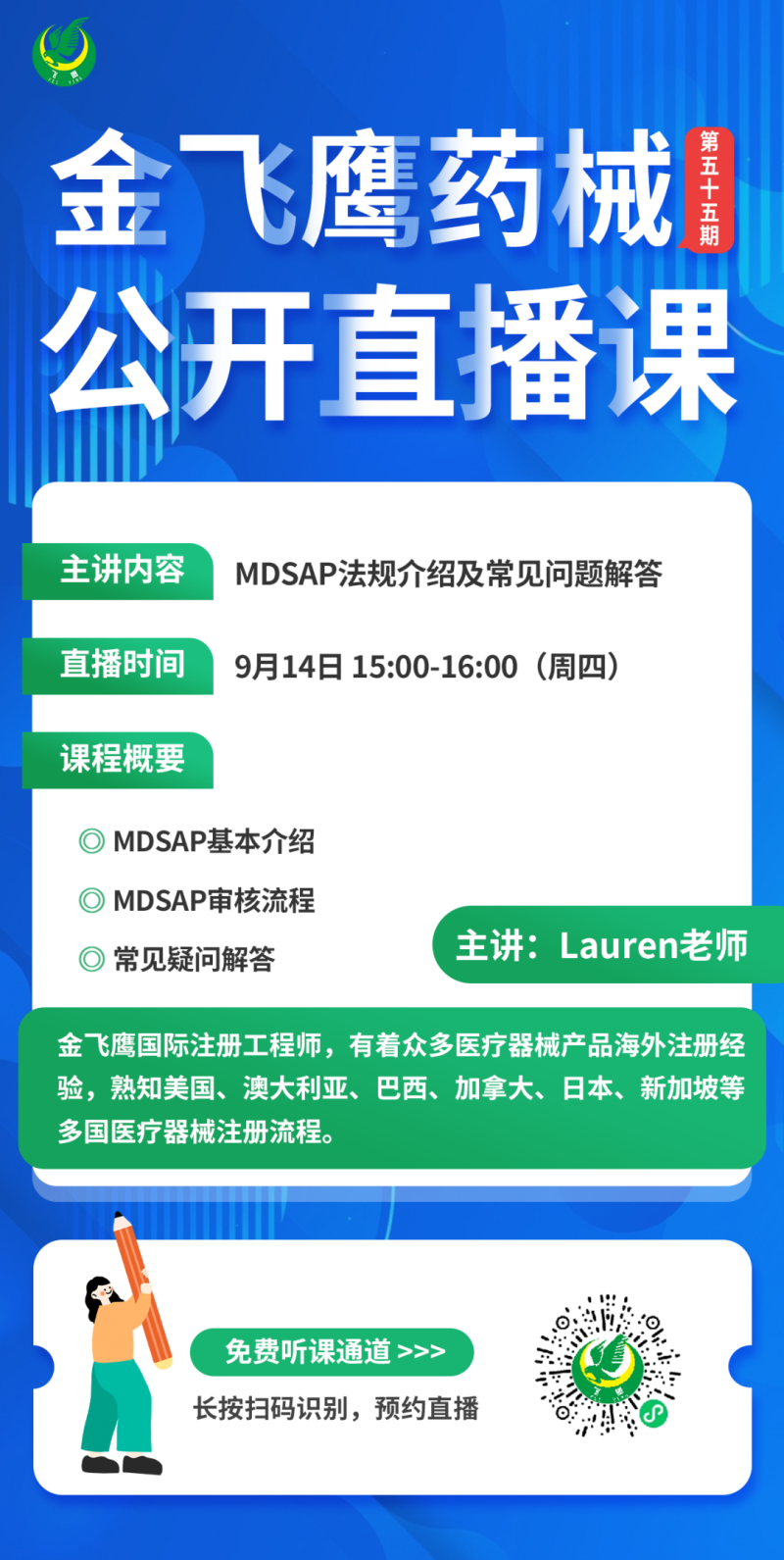9月14日下午3點(diǎn),金飛鷹國際注冊工程師,有著眾多醫(yī)療器械產(chǎn)品海外注冊經(jīng)驗(yàn),熟知美國、澳大利亞、巴西、日本等多國注冊流程的Lauren老師,給大家?guī)怼禡DSAP法規(guī)介紹及常見問題解答》,培訓(xùn)內(nèi)容包括MDSAP基本介紹、MDSAP審核流程以及常見問題解答等,大家千萬不要錯(cuò)過了哦!