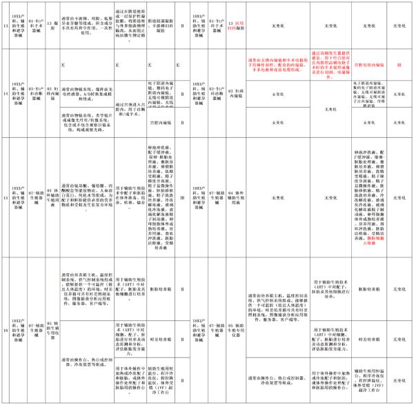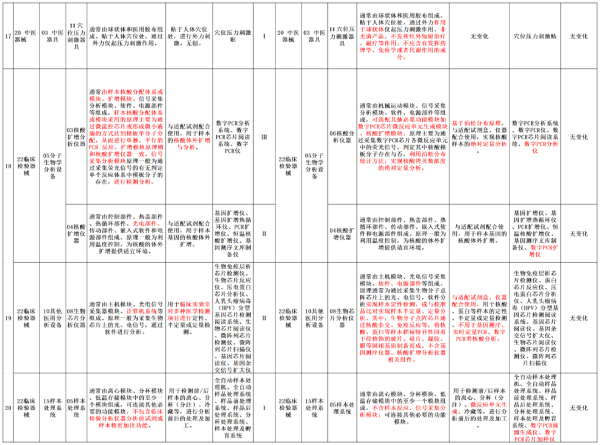 本次調(diào)整意見對20類醫(yī)療器械產(chǎn)品進行了產(chǎn)品描述、預期用途或管理類別的調(diào)整,我們以圖片形式將其展示如下(點擊圖片可放大查看):