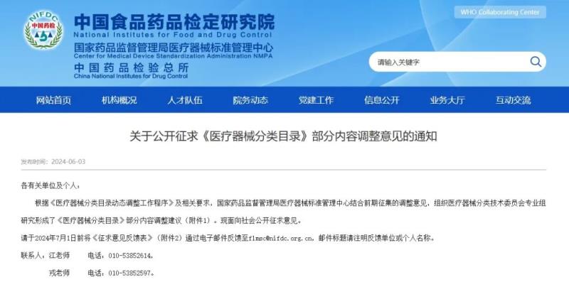 6月3日,國家藥監(jiān)局醫(yī)療器械標管中心發(fā)布《關于公開征求〈醫(yī)療器械分類目錄〉部分內(nèi)容調(diào)整意見的通知》,并向社會公開征求意見。