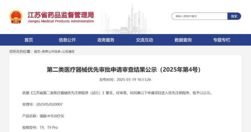 3月19日,江蘇省藥監(jiān)局發(fā)布一則第二類醫(yī)療器械優(yōu)先審批申請(qǐng)審查結(jié)果公示,其中提到,依據(jù)《江蘇省第二類醫(yī)療器械優(yōu)先注冊(cè)程序(試行)》要求,經(jīng)審查,擬同意大悅創(chuàng)新(蘇州)醫(yī)療科技股份有限公司申請(qǐng)的強(qiáng)脈沖光治療儀項(xiàng)目進(jìn)入優(yōu)先注冊(cè)程序,并予以公示。