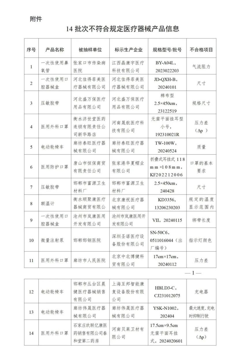 近日,河北省藥監(jiān)局發(fā)布《全省醫(yī)療器械監(jiān)督抽檢結(jié)果的公告(2025年第一期)》,其中提到,該局組織對2024年全省生產(chǎn)、經(jīng)營和使用等環(huán)節(jié)醫(yī)療器械進行了質(zhì)量監(jiān)督抽檢,共發(fā)現(xiàn)14批次產(chǎn)品不符合標(biāo)準(zhǔn)規(guī)定,包括一次性使用鼻氧管、醫(yī)用外科口罩、電動輪椅車、微量注射泵等,具體明細如下: