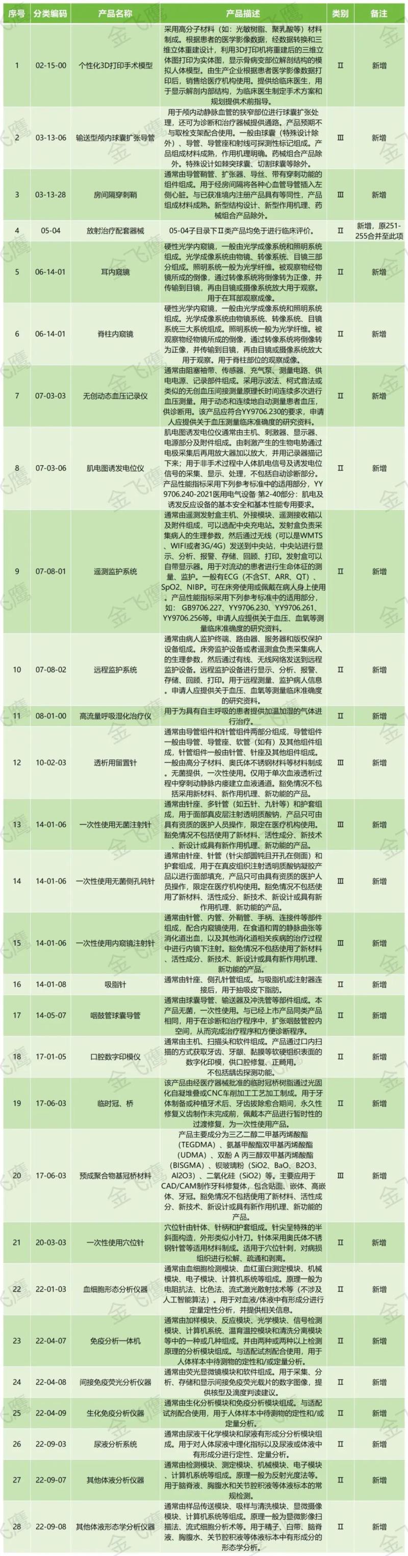 5月13日,國家藥監(jiān)局官網(wǎng)發(fā)布《免于進(jìn)行臨床評價醫(yī)療器械目錄(2025年)》(以下簡稱《目錄》),本次《目錄》中共包含1047類(2023年為1025類)產(chǎn)品,通過查看附件我們可以發(fā)現(xiàn),本次新增的免臨床產(chǎn)品包括個性化3D打印手術(shù)模型、無創(chuàng)動態(tài)血壓記錄儀、遠(yuǎn)程監(jiān)護(hù)系統(tǒng)、一次性使用無菌注射針(用于面部真皮層注射透明質(zhì)酸鈉)等。由于《目錄》全文字?jǐn)?shù)較多,不便在文章中全部展示,我們僅將本次新增的免臨床評價產(chǎn)品匯總?cè)缦拢怨┫嚓P(guān)企業(yè)參考: