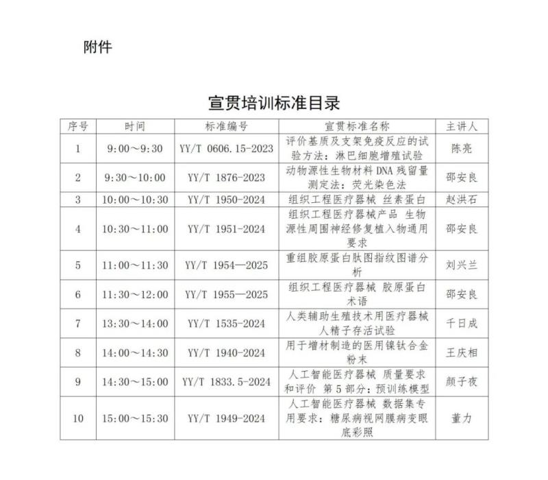 對(duì)YY/T 0606.15-2023《評(píng)價(jià)基質(zhì)及支架免疫反應(yīng)的試驗(yàn)方法:淋巴細(xì)胞增殖試驗(yàn)》、YY/T 1955-2025《組織工程醫(yī)療器械 膠原蛋白術(shù)語(yǔ)》、YY/T 1833.5-2024《人工智能醫(yī)療器械 質(zhì)量要求和評(píng)價(jià) 第5部分:預(yù)訓(xùn)練模型》等10項(xiàng)行業(yè)標(biāo)準(zhǔn)進(jìn)行宣貫培訓(xùn),具體清單及安排如下: