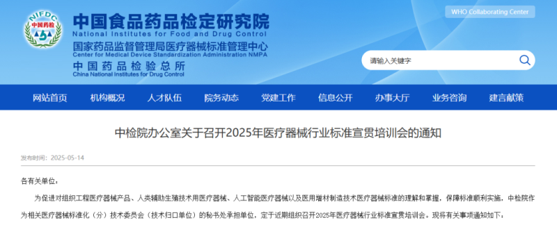 5月14日,中檢院發(fā)布一則2025年醫(yī)療器械行業(yè)標(biāo)準(zhǔn)宣貫培訓(xùn)會(huì)的通知,其中提到,該院近期將對(duì)組織工程醫(yī)療器械產(chǎn)品、人類輔助生殖技術(shù)用醫(yī)療器械、人工智能醫(yī)療器械以及醫(yī)用增材制造技術(shù)醫(yī)療器械標(biāo)準(zhǔn)進(jìn)行宣貫培訓(xùn)。有關(guān)事項(xiàng)具體如下: