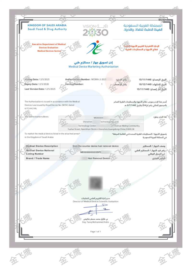 繼美容面罩后,金飛鷹又成功輔導(dǎo)深圳一家企業(yè)取得脫毛儀的沙特上市許可