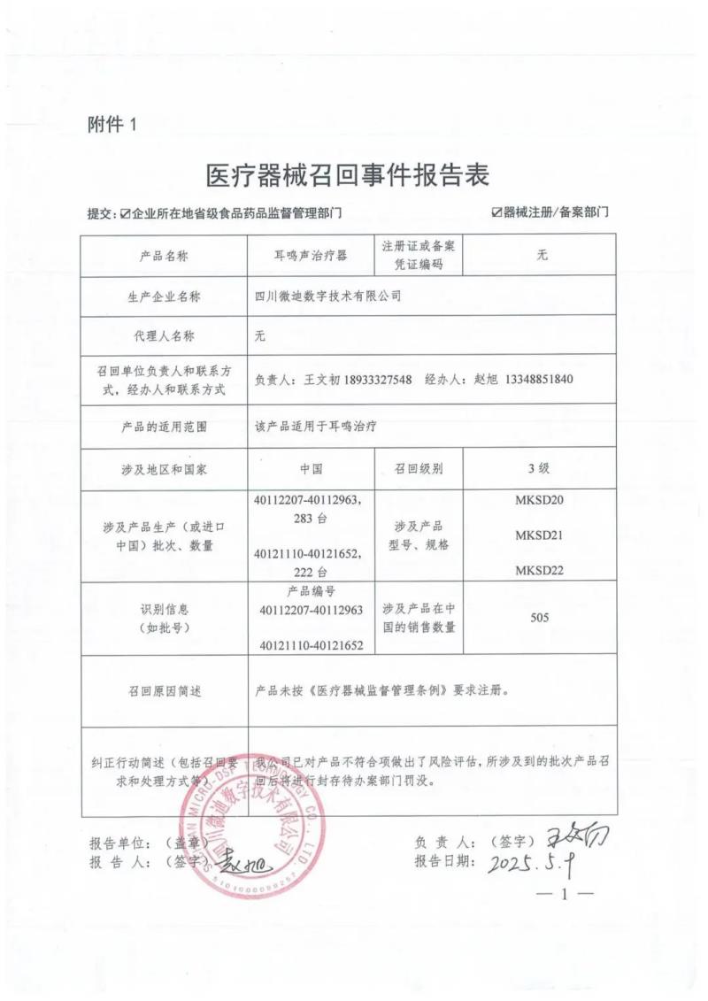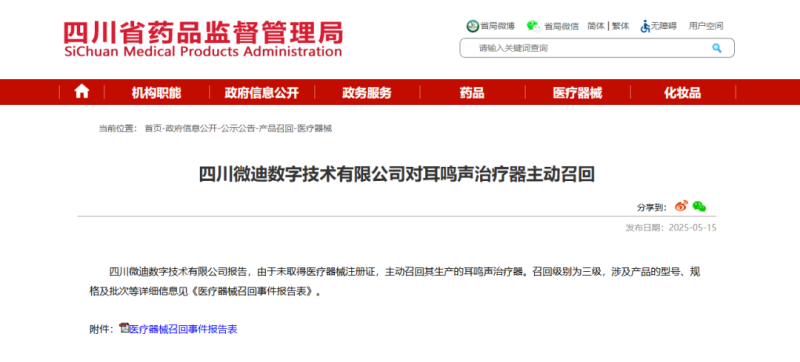 近日,四川省藥監(jiān)局發(fā)布一則醫(yī)療器械召回公告,其中提到,四川微迪數(shù)字技術(shù)有限公司報(bào)告,由于未取得醫(yī)療器械注冊證,主動(dòng)召回其生產(chǎn)的耳鳴聲治療器。召回級(jí)別為三級(jí),涉及產(chǎn)品的型號(hào)、規(guī)格及批次等詳細(xì)信息如下: