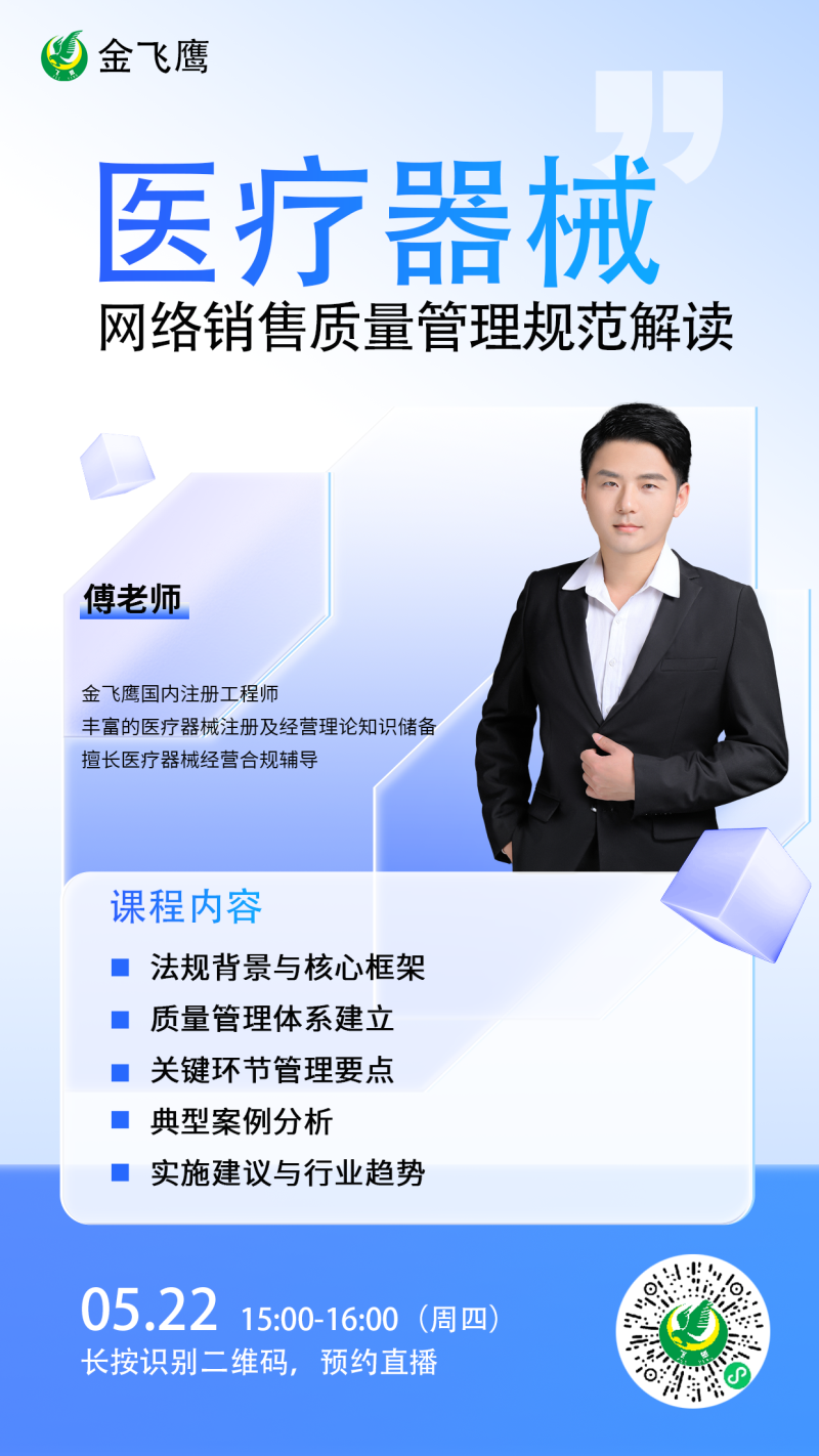 5月22日下午3點,金飛鷹國內(nèi)注冊工程師、擅長醫(yī)療器械經(jīng)營合規(guī)輔導(dǎo)的傅老師給大家?guī)怼夺t(yī)療器械網(wǎng)絡(luò)銷售質(zhì)量管理規(guī)范解讀》,他將立足醫(yī)療器械網(wǎng)絡(luò)銷售監(jiān)管新形勢,系統(tǒng)解讀《規(guī)范》的立法背景與核心要求,幫助企業(yè)準(zhǔn)確把握政策要點。同時,傅老師還將重點剖析網(wǎng)絡(luò)銷售企業(yè)如何構(gòu)建符合法規(guī)要求的質(zhì)量管理體系及關(guān)鍵環(huán)節(jié)管理要點,并通過典型案例分析,為企業(yè)規(guī)避經(jīng)營風(fēng)險提供實用指導(dǎo)。