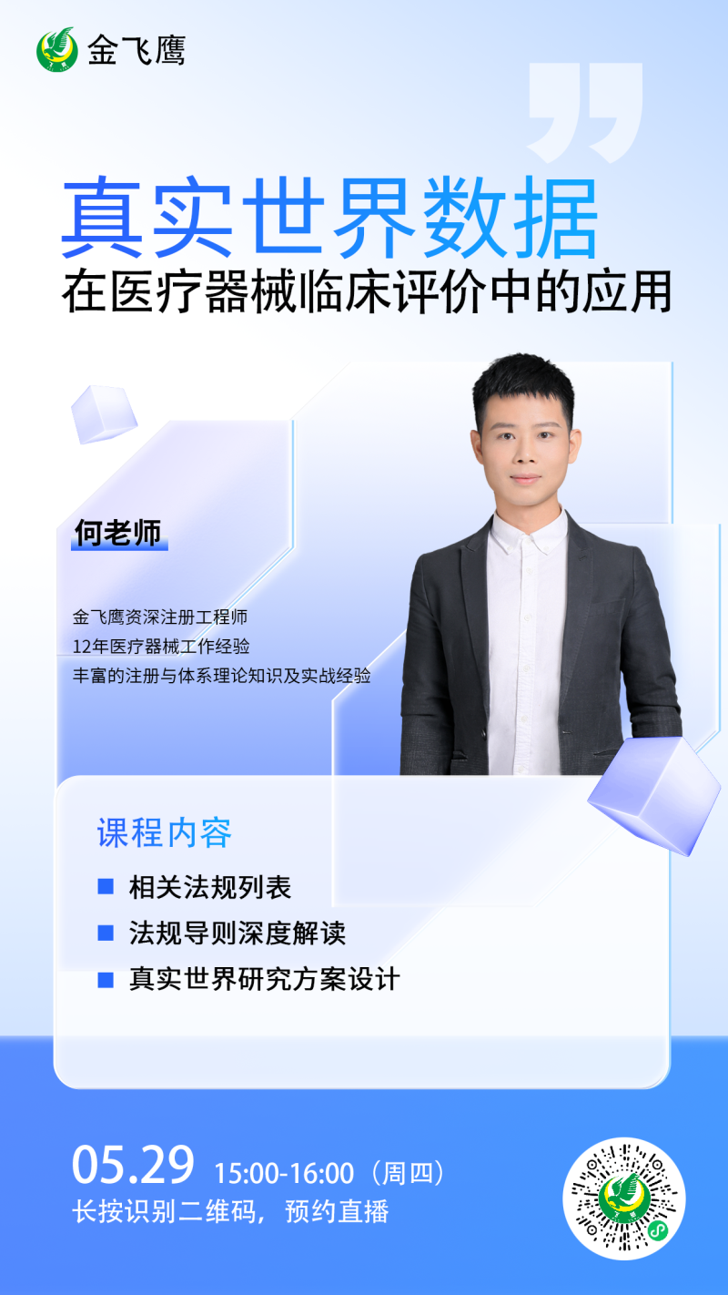 5月29日下午3點,金飛鷹資深注冊工程師、有著12年醫(yī)療器械行業(yè)從業(yè)經(jīng)驗的何老師給大家?guī)怼墩鎸嵤澜鐢?shù)據(jù)在醫(yī)療器械臨床評價中的應(yīng)用》,他將立足法規(guī)要求,結(jié)合實戰(zhàn)案例,重點解析真實世界研究方案設(shè)計要點,為企業(yè)高效開展真實世界數(shù)據(jù)應(yīng)用提供專業(yè)指導。