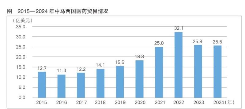 據(jù)中國海關(guān)統(tǒng)計(jì)數(shù)據(jù),中馬兩國醫(yī)藥貿(mào)易額由2015年的12.7億美元,增長至2024年的25.5億美元(詳見下圖),10年間復(fù)合增長率為7.22%,總體保持增長態(tài)勢。