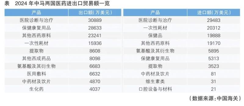 中馬兩國在疫苗、醫(yī)院診斷與治療、保健康復(fù)等醫(yī)藥產(chǎn)品中的合作進(jìn)一步深化。2024年,醫(yī)院診斷與治療產(chǎn)品貿(mào)易額較高,約為6.04億美元,其他西藥原料、一次性耗材等產(chǎn)品貿(mào)易額均超過1億美元(詳見表)。