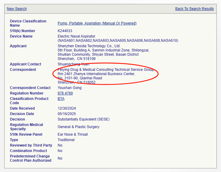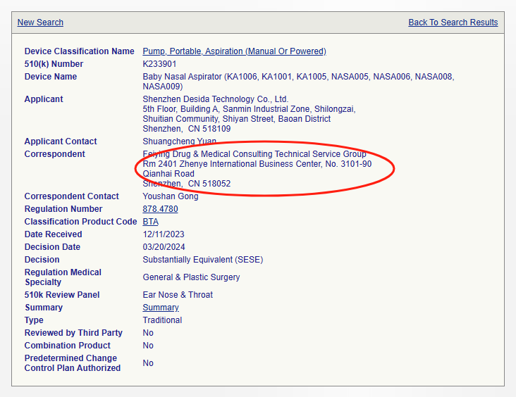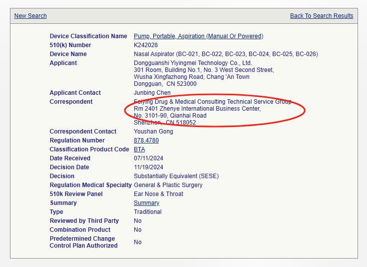 我們在FDA 510(k)數據庫用產品代碼BTA進行檢索,近兩年來由金飛鷹申報并作為官方Correspondent的有如下企業(yè)的吸鼻器產品: