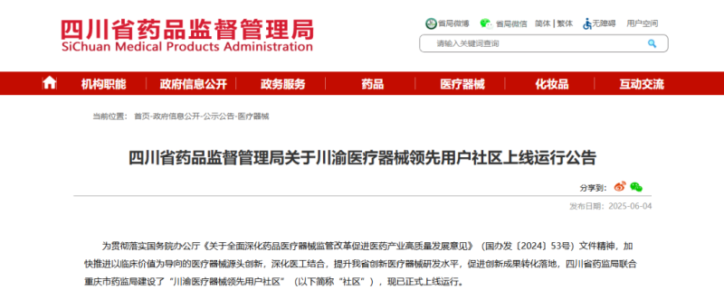 該社區(qū)平臺(tái)的開發(fā)上線是落實(shí)國務(wù)院辦公廳《關(guān)于全面深化藥品醫(yī)療器械監(jiān)管改革促進(jìn)醫(yī)藥產(chǎn)業(yè)高質(zhì)量發(fā)展意見》(國辦發(fā)〔2024〕53號(hào))文件精神的重要舉措。四川省藥監(jiān)局相關(guān)負(fù)責(zé)人表示,今后將持續(xù)拓展優(yōu)化社區(qū)平臺(tái)功能,逐步擴(kuò)大行業(yè)用戶覆蓋面,進(jìn)一步整合省內(nèi)臨床和醫(yī)療器械研發(fā)資源,為醫(yī)療器械創(chuàng)新研發(fā)提供全方位、全過程的服務(wù)支撐,助力臨床研究成果轉(zhuǎn)化,營造良好醫(yī)療器械創(chuàng)新生態(tài)。