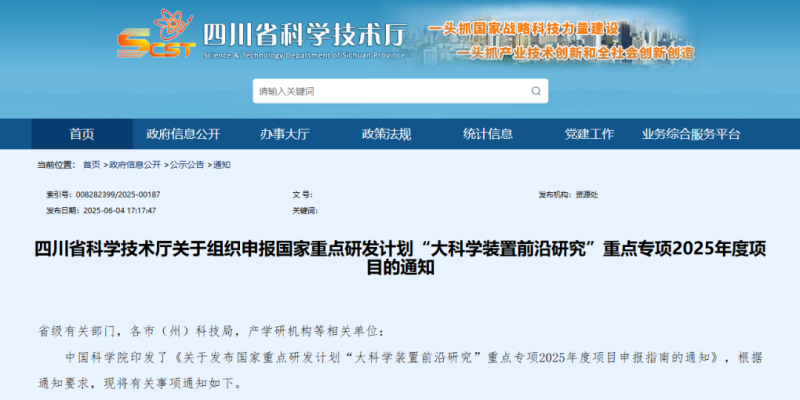 近日,四川省科學(xué)技術(shù)廳發(fā)布《關(guān)于組織申報國家重點研發(fā)計劃“大科學(xué)裝置前沿研究”重點專項2025年度項目的通知》,具體事項如下: