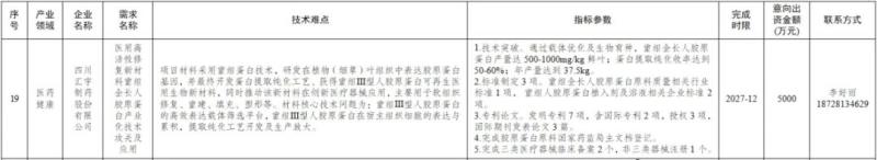 近日,四川省經濟和信息化廳發(fā)布《關于開展2025年第三批企業(yè)找技術“雙向揭榜掛帥”項目申報工作的通知》(以下簡稱《通知》),對應2025年第三批企業(yè)找技術“雙向揭榜掛帥”榜單的20家發(fā)榜企業(yè)的技術需求,公開征集解決方案。本次涉及人工智能、航空航天、高端能源設備、低空經濟、新能源汽車及動力電池、軟件和信息服務、醫(yī)藥健康、農產品精深加工8個產業(yè)領域,其中有一個醫(yī)藥健康領域項目——“醫(yī)用高活性修復新材料重組全長人膠原蛋白產業(yè)化技術攻關及應用”,具體明細如下: