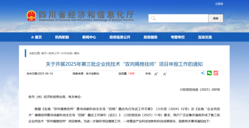 (二)系統(tǒng)填報。6月30日18:00前,揭榜方須登錄四川省經濟和信息化廳官方網站“益企服務超市”中“企業(yè)找技術揭榜掛帥”工作專欄,填寫提交揭榜申報書、揭榜方案、必要證明材料等。未在工作專欄中提交揭榜申報書及逾期申報的不予受理。