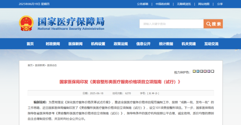 6月18日,國家醫(yī)保局印發(fā)了《美容整形類醫(yī)療服務(wù)價格項目立項指南(試行)》(以下簡稱《指南》),共規(guī)定了101項美容整形項目的服務(wù)價格相關(guān)內(nèi)容,包括價格構(gòu)成、計價單位等,如光/激光美容治療費的計價單位為光斑,射頻、超聲、微針等美容治療費的計價單位均為平方厘米……