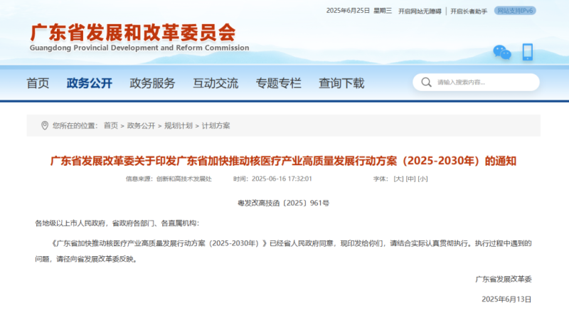 近日,廣東省發(fā)展和改革委員會發(fā)布《廣東省加快推動核醫(yī)療產(chǎn)業(yè)高質(zhì)量發(fā)展行動方案(2025-2030年)》(以下簡稱《方案》),從提升核醫(yī)療科技創(chuàng)新水平、健全醫(yī)用同位素供應(yīng)體系等8方面共提出了20條措施,《方案》全文如下: