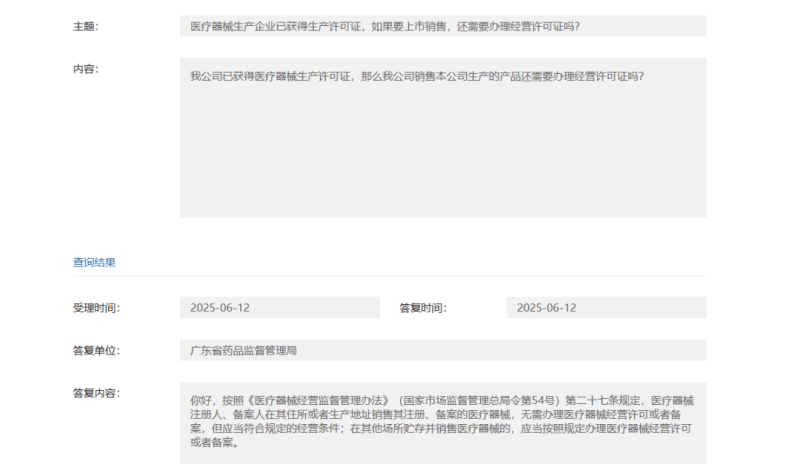 根據(jù)廣東省藥監(jiān)局的答復(fù),按照《醫(yī)療器械經(jīng)營(yíng)監(jiān)督管理辦法》(國(guó)家市場(chǎng)監(jiān)督管理總局令第54號(hào))第二十七條規(guī)定,醫(yī)療器械注冊(cè)人、備案人在其住所或者生產(chǎn)地址銷(xiāo)售其注冊(cè)、備案的醫(yī)療器械,無(wú)需辦理醫(yī)療器械經(jīng)營(yíng)許可或者備案,但應(yīng)當(dāng)符合規(guī)定的經(jīng)營(yíng)條件;在其他場(chǎng)所貯存并銷(xiāo)售醫(yī)療器械的,應(yīng)當(dāng)按照規(guī)定辦理醫(yī)療器械經(jīng)營(yíng)許可或者備案。