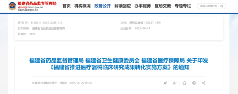 近日,福建省藥監(jiān)局發(fā)布《福建省推進醫(yī)療器械臨床研究成果轉化實施方案》(以下簡稱《方案》),推進以臨床價值為導向的醫(yī)療器械源頭創(chuàng)新,通過廣泛挖掘臨床醫(yī)生的醫(yī)療器械創(chuàng)新創(chuàng)意,將來自臨床的解決方案與醫(yī)療器械研發(fā)有效結合。