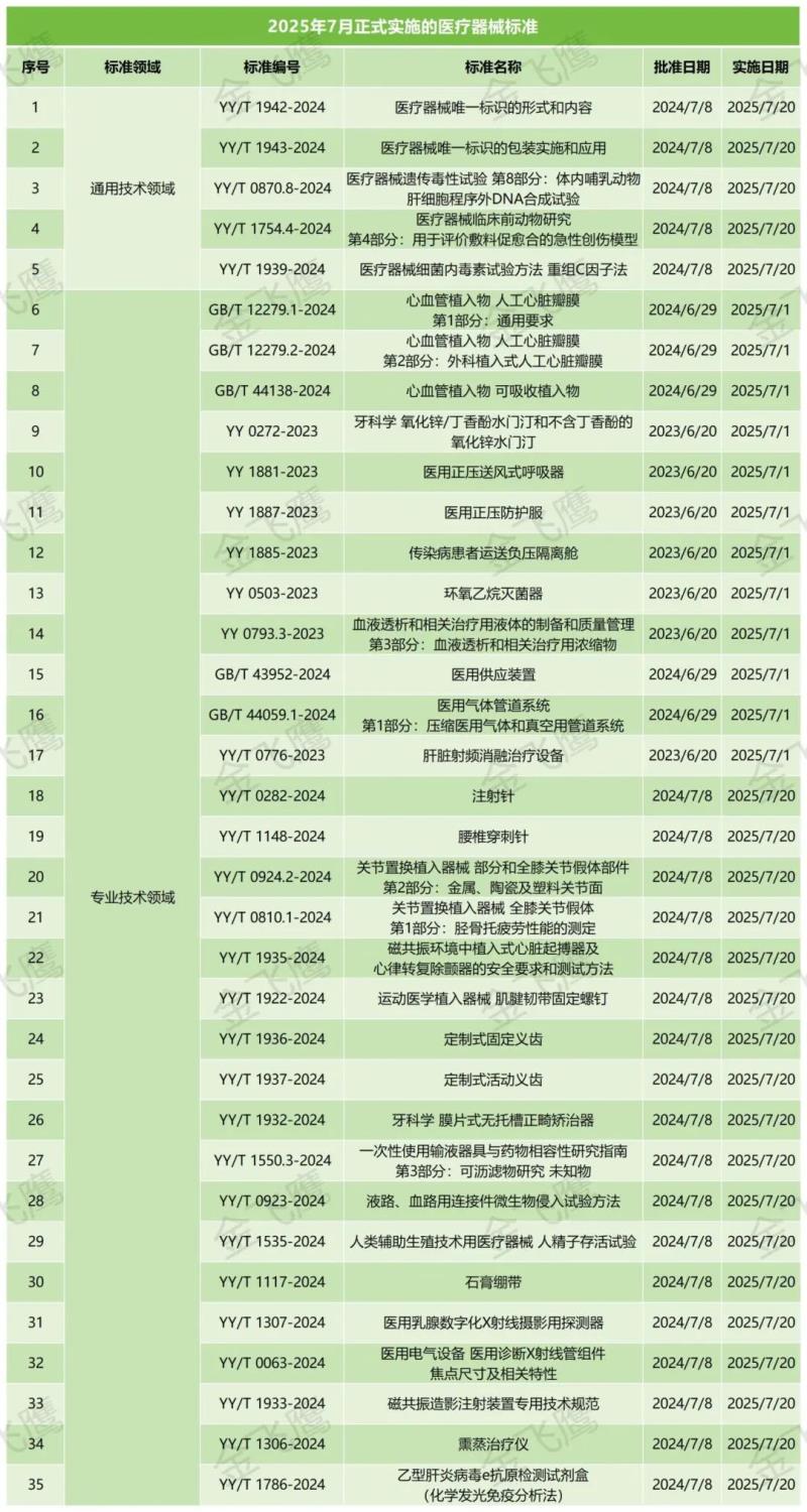 根據(jù)金飛鷹匯總整理,2025年7月起正式實(shí)施的醫(yī)療器械標(biāo)準(zhǔn)共有35項(xiàng),其中已于7月1日實(shí)施的有GB/T 12279.1-2024《心血管植入物 人工心臟瓣膜 第1部分:通用要求》、YY 1887-2023《醫(yī)用正壓防護(hù)服》、YY 0503-2023《環(huán)氧乙烷滅菌器》等共12項(xiàng),即將于7月20日實(shí)施的有YY/T 1942-2024《醫(yī)療器械唯一標(biāo)識的形式和內(nèi)容》、YY/T 0282-2024《注射針》、YY/T 1936-2024《定制式固定義齒》等共23項(xiàng),具體明細(xì)如下: