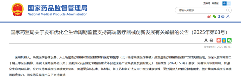 7月3日,國家藥監(jiān)局發(fā)布《關(guān)于發(fā)布優(yōu)化全生命周期監(jiān)管支持高端醫(yī)療器械創(chuàng)新發(fā)展有關(guān)舉措的公告》(以下簡(jiǎn)稱《公告》),針對(duì)醫(yī)用機(jī)器人、高端醫(yī)學(xué)影像設(shè)備、人工智能醫(yī)療器械和新型生物材料醫(yī)療器械等(以下簡(jiǎn)稱高端醫(yī)療器械),提出優(yōu)化特殊審批程序、完善分類和命名規(guī)則、持續(xù)健全標(biāo)準(zhǔn)體系等十方面支持舉措。