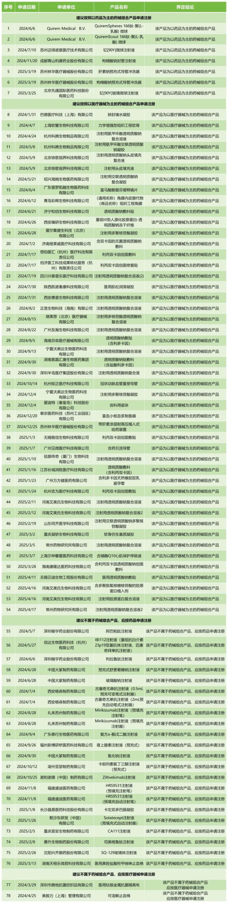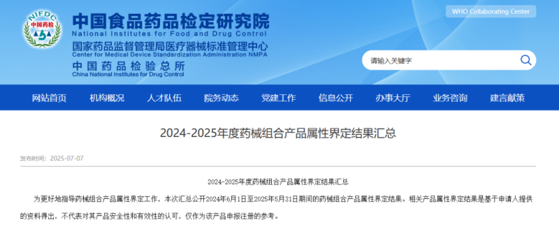 7月7日,中檢院匯總公開了2024年6月1日至2025年5月31日期間的藥械組合產(chǎn)品屬性界定結(jié)果,共包含78款產(chǎn)品,其中建議按照以藥品為主的藥械組合產(chǎn)品申請注冊有7款,建議按照以醫(yī)療器械為主的藥械組合產(chǎn)品申請注冊有47款,建議應(yīng)按藥品申請注冊的有22款,建議應(yīng)按醫(yī)療器械申請注冊有2款,具體明細(xì)如下: