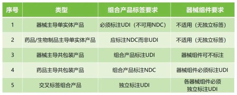 該草案提到,如21 CFR第3部分所述,組合產(chǎn)品由兩種或兩種以上不同類型的產(chǎn)品組成(即藥物、器械和/或生物制品的組合)。在組合產(chǎn)品中所包含的每種藥物、器械和生物制品都被稱為該組合產(chǎn)品的組成部分。一般包括單一實體組合產(chǎn)品、共包裝組合產(chǎn)品及交叉標簽組合產(chǎn)品等,相應的UDI要求如下: