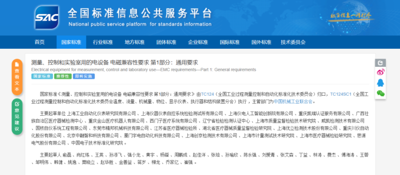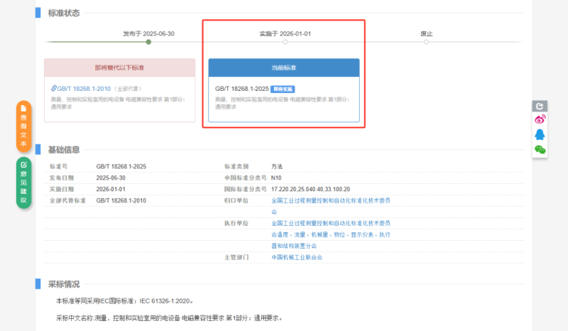 據(jù)全國標(biāo)準(zhǔn)信息公共服務(wù)平臺近日公布,GB/T 18268.1-2025《測量、控制和實驗室用的電設(shè)備 電磁兼容性要求 第1部分:通用要求》推薦性國家標(biāo)準(zhǔn)批準(zhǔn)發(fā)布,該標(biāo)準(zhǔn)即將替代GB/T 18268.1-2010,于2026年1月1日起正式實施。據(jù)悉,該標(biāo)準(zhǔn)等同采用IEC國際標(biāo)準(zhǔn):IEC 61326-1:2020。