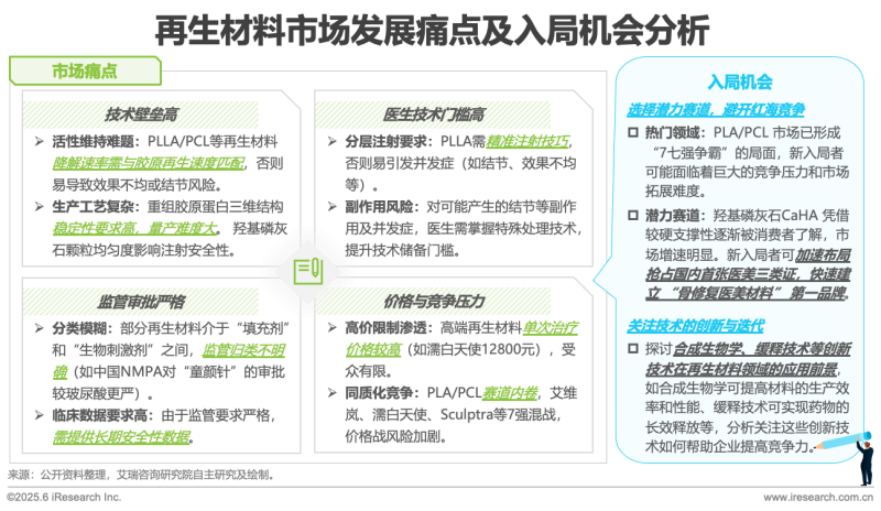 再生材料市場正面臨著技術(shù)壁壘高、醫(yī)生技術(shù)門檻高、監(jiān)管審批嚴格以及價格與競爭壓力大的多重挑戰(zhàn)。然而,市場痛點背后也蘊藏著入局機會。新入局者可選擇潛力賽道,避開紅海競爭,如羥基磷灰石CaHA憑借其較硬支撐性逐漸被消費者了解,市場增長迅速,新入局者可加速布局,搶占國內(nèi)尚未有三類證的先機,快速建立品牌優(yōu)勢。同時,要關(guān)注技術(shù)的創(chuàng)新與迭代,比如合成生物學可提高材料的生產(chǎn)效率和性能,緩釋技術(shù)可實現(xiàn)藥物的長效釋放等,深入分析這些創(chuàng)新技術(shù)在再生材料領(lǐng)域的應用前景,助力企業(yè)提高競爭力,從而在再生材料市場中尋得發(fā)展新路徑。