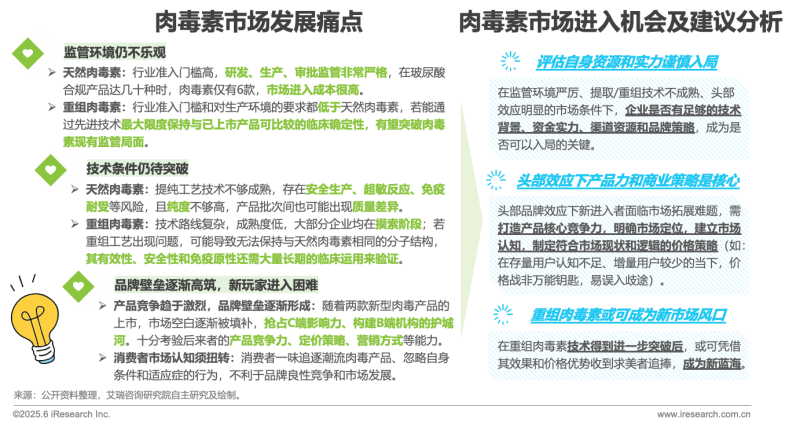 雖然肉毒素市場開始走向白熱化競爭,且我國肉毒素滲透率遠低于全球、仍有很大發(fā)展空間;但考慮到當前的醫(yī)美人群整體增量少,老牌肉毒品牌力強導致市場空間有限,監(jiān)管環(huán)境不容樂觀,技術(shù)條件不夠成熟等市場條件;不管是企業(yè)還是資本,投資肉毒素的“投入產(chǎn)出比”都是最核心的問題。因此,企業(yè)需評估自身資源和實力謹慎入局;在頭部效應的壁壘下,產(chǎn)品力強、渠道資源力強、市場定位明確、價格策略合適的產(chǎn)品才能獲得脫穎而出的機會。未來,隨著新產(chǎn)品的相繼涌出、低成本的重組技術(shù)的發(fā)展,市場競爭將愈演愈烈,肉毒素企業(yè)可能需要做好打“價格戰(zhàn)”的準備,或去海外尋找一些新的合作機會。