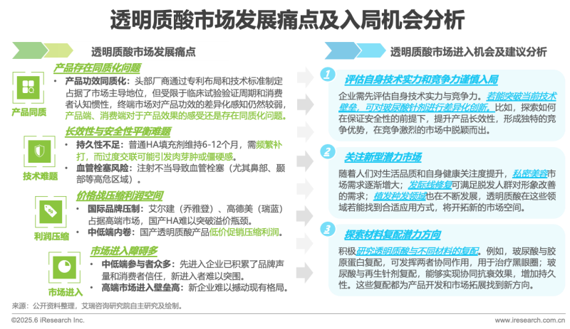 中國透明質(zhì)酸行業(yè)近年來經(jīng)歷了顯著的增長,這一趨勢得益于市場需求的不斷擴大以及應用領(lǐng)域的持續(xù)拓展。然而,在這一高速增長的背后,行業(yè)也面臨著產(chǎn)品同質(zhì)化、長效性與安全性平衡難題、價格戰(zhàn)和市場進入障礙等痛點。盡管如此,行業(yè)的發(fā)展并非沒有機遇。技術(shù)創(chuàng)新是實現(xiàn)產(chǎn)品差異化的關(guān)鍵,企業(yè)可以通過研發(fā)新技術(shù)、改進生產(chǎn)工藝等方式,提升產(chǎn)品的競爭力。企業(yè)若能評估自身技術(shù)實力實現(xiàn)差異化創(chuàng)新,關(guān)注私密美容等新型潛力市場,探索與膠原蛋白等材料復配的潛力方向,也能在競爭中尋得入局發(fā)展的機會。