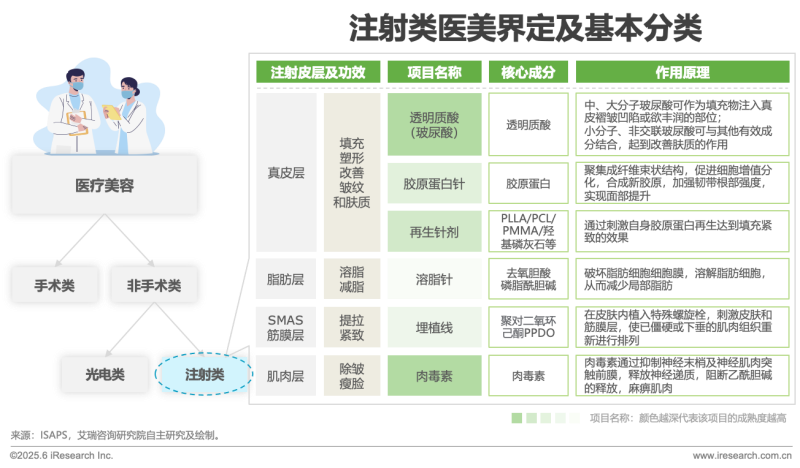 近年來,中國醫(yī)美市場呈現(xiàn)爆發(fā)式增長態(tài)勢,其中以聲光電類和注射類項目最受消費者青睞,已成為醫(yī)美消費的“雙引擎”。從市場表現(xiàn)來看,聲光電類項目市場份額略高于注射類項目,這類項目主要以緊致抗衰為主,多為無創(chuàng)/微創(chuàng)項目,以更“輕”的手段達到抗衰的目的吸引了更多消費者。但事實上,注射類項目同樣占據(jù)著舉足輕重的市場地位,為幫助行業(yè)從業(yè)者更深入了解注射類醫(yī)美市場,本期文章我們部分轉(zhuǎn)載了艾瑞咨詢的《中國注射類醫(yī)美行業(yè)研究報告》,以供相關(guān)企業(yè)參考。