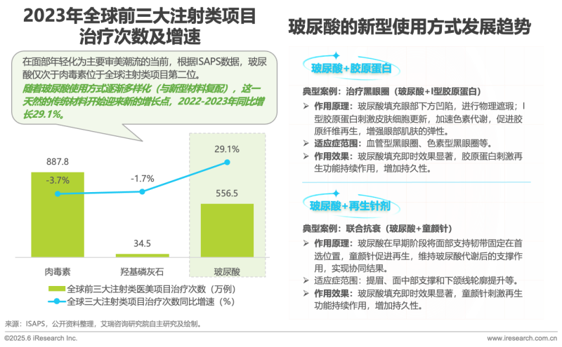 隨著醫(yī)美上游材料的多樣化,玻尿酸作為“頂流”的地位是否會受到?jīng)_擊一直是行業(yè)內(nèi)熱議的話題。根據(jù)ISAPS數(shù)據(jù),2023年全球注射類項目排名中,玻尿酸僅次于肉毒素位居第二。但隨著玻尿酸的復配方式多樣化、聯(lián)合治療手段越來越成熟,其應用邊界被不斷拓寬,2022-2023年增速遠超肉毒素達29.1%,似乎迎來了它的“第二增長曲線”。