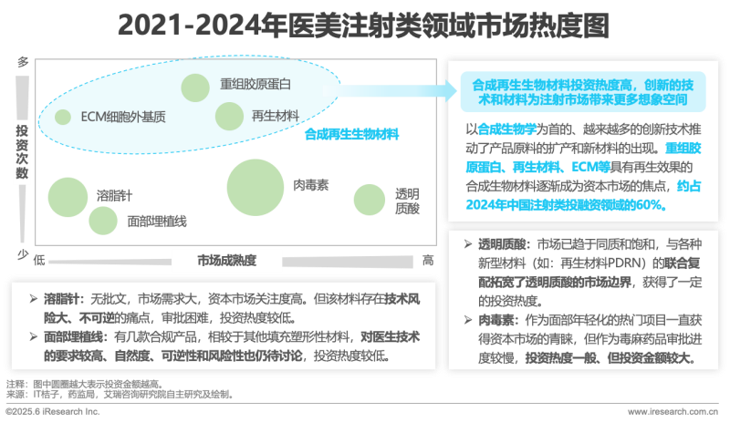 技術(shù)的進步推動著上游原料的擴產(chǎn)和材料的多樣化、安全化和同源化,ECM等各種新型材料不斷出現(xiàn),以重組膠原蛋白、再生材料等為首的合成再生生物材料成為醫(yī)美機構(gòu)投資重點。根據(jù)IT桔子數(shù)據(jù),2024年包括泰美瑞、圣至潤和等在內(nèi)的再生生物材料領(lǐng)域的企業(yè)紛紛融資,投資事件約占總注射類材料投資的60%。按照審批情況來看,根據(jù)藥監(jiān)局不完全統(tǒng)計,截止到2024年11月一共有15款針劑通過審批,以玻尿酸類為主,還有幾款聚左旋乳酸、聚己內(nèi)酯和肉毒素類產(chǎn)品。雖然玻尿酸領(lǐng)域近年來投資熱度一般,但其仍為注射類市場的“老字號產(chǎn)品”和“熱門賽道”,與各種新型材料的聯(lián)合復配也將進一步豐富產(chǎn)品矩陣,拓寬注射類市場邊界。