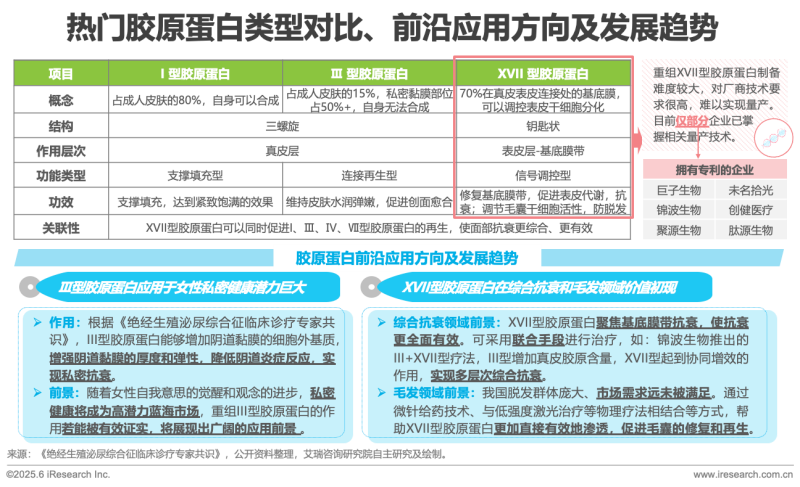 膠原蛋白按照結(jié)構(gòu)和功能可以劃分為28種類型(包括I、Ⅱ、Ⅲ、Ⅳ、Ⅴ、Ⅵ、Ⅹ、XVII…),每種類型的膠原蛋白在人體中扮演著不同的角色。近年來,醫(yī)美行業(yè)應用最為廣泛的是I型和Ⅲ型膠原蛋白,起到面部支撐填充及皮膚水潤彈嫩的效果,是抗衰界的潮流產(chǎn)品。隨著對這兩種膠原蛋白適應癥的不斷開拓、專業(yè)玩家技術(shù)的成熟及下游消費者需求的進階,以XVII型為代表的更多類型的膠原蛋白及其多元功效被不斷發(fā)掘,終端應用場景不斷拓展,產(chǎn)品矩陣日漸豐富。