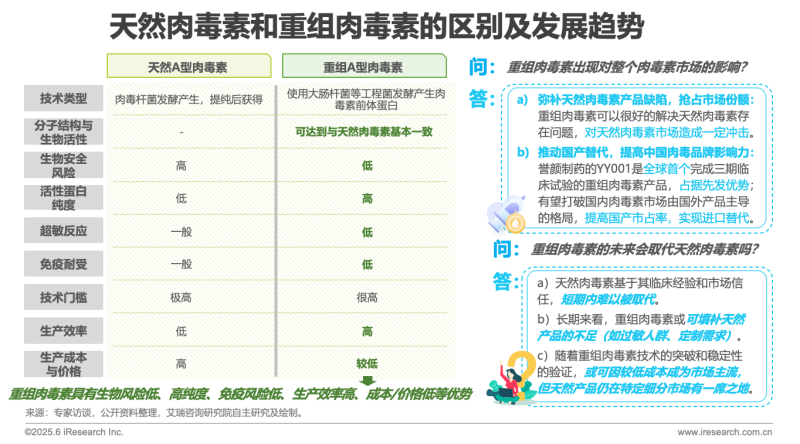 天然肉毒素是從肉毒桿菌培養(yǎng)液中提取的神經(jīng)毒素,含有毒素蛋白及輔助蛋白,臨床應用歷史悠久,但可能存在批次差異和雜質(zhì)風險。重組肉毒素通過基因工程生產(chǎn),僅含純化毒素蛋白,純度高、穩(wěn)定性強,并可定制化調(diào)整效力或持久性。未來,重組肉毒素有望憑借安全性和可設計性逐步滲透醫(yī)美市場,但短期內(nèi)天然產(chǎn)品仍占主導。長期來看,兩者可能共存——重組產(chǎn)品側(cè)重高純度、個性化需求,而天然產(chǎn)品依賴品牌信任和成熟應用。技術(shù)進步和成本優(yōu)化將是重組肉毒素能否顛覆市場的關(guān)鍵。