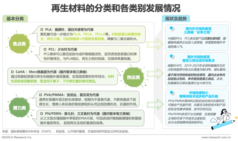 醫(yī)美再生注射類產(chǎn)品通常以微球的形式存在,通過刺激人體自身膠原蛋白的再生,起到填充凹陷、緊致肌膚、美容塑型的作用。醫(yī)美再生材料種類較多,近兩年市場焦點基本集中在聚乳酸(PLA)和聚己內(nèi)酯(PCL)兩大類別,以童顏針、少女針為代表的一系列再生針劑賦予醫(yī)美市場更豐富的品類和更高的增速,也成為各大廠商進軍再生領(lǐng)域的“必爭之地”。其次,羥基磷灰石(CaHA)作為人體中天然存在的一種材料廣泛用于骨修復,它較硬的支撐性或可推動其未來在隆鼻、墊下巴等填充領(lǐng)域獲得較大市場份額。