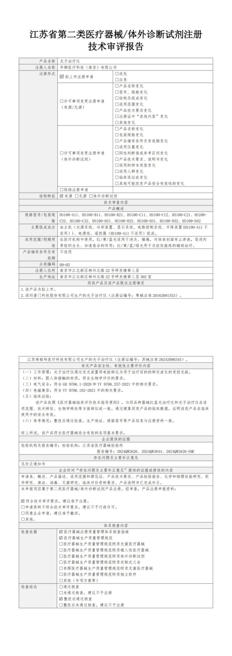 7月12日,江蘇省藥監(jiān)局公布了2025年6月批準(zhǔn)注冊(cè)的重組膠原蛋白噴劑敷料、明火艾灸儀、立體動(dòng)態(tài)干擾電治療儀、定制式增材制造截骨導(dǎo)板、穿戴式動(dòng)態(tài)心電記錄儀、運(yùn)動(dòng)氣壓治療系統(tǒng)、眼底照相機(jī)、掌上超聲波電刺激治療儀、光子治療儀、磁振熱治療儀等151個(gè)醫(yī)療器械產(chǎn)品目錄,同時(shí)隨附了所有產(chǎn)品的技術(shù)審評(píng)報(bào)告,我們其中“光子治療儀”(預(yù)期用途:在醫(yī)療機(jī)構(gòu)中使用,紅/黃/藍(lán)光適用于消炎、鎮(zhèn)痛,對(duì)體表創(chuàng)面有止?jié)B液,促進(jìn)肉芽組織生長(zhǎng)、加速愈合的作用;紅/黃/藍(lán)/綠光用于炎癥性痤瘡的輔助治療)的技術(shù)審評(píng)報(bào)告以圖片形式轉(zhuǎn)載如下: