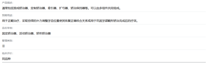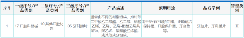 我們通過查看本次獲證產(chǎn)品的“結(jié)構(gòu)及組成”可以看到,此類產(chǎn)品“由具有醫(yī)療器械注冊證的牙科膜片經(jīng)壓制成型后打磨、拋光而成?!币虼?,牙膠片/牙科膜片是正畸矯治器最為關(guān)鍵的一項原材料,可以外購,也可以企業(yè)自己生產(chǎn),但前提是要有注冊證(同樣是Ⅱ類產(chǎn)品,分類編碼17-10-05)。