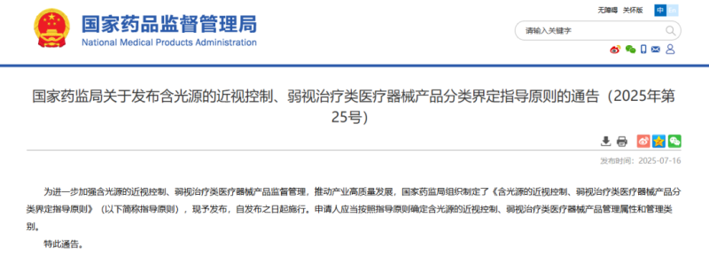 7月16日,國家藥監(jiān)局發(fā)布《含光源的近視控制、弱視治療類醫(yī)療器械產品分類界定指導原則》(以下簡稱《指導原則》),并宣布自發(fā)布之日起施行。