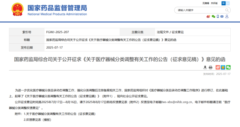 7月17日,國家藥監(jiān)局發(fā)布《關(guān)于醫(yī)療器械分類調(diào)整有關(guān)工作的公告(征求意見稿)》(以下簡稱《分類調(diào)整公告》),現(xiàn)向社會(huì)公開征求意見。